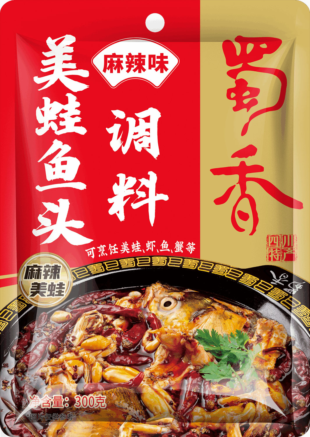 2、锅中加150g菜籽油加热烧熟,加入将蜀香美蛙鱼头调料,加上1000g水烧开;