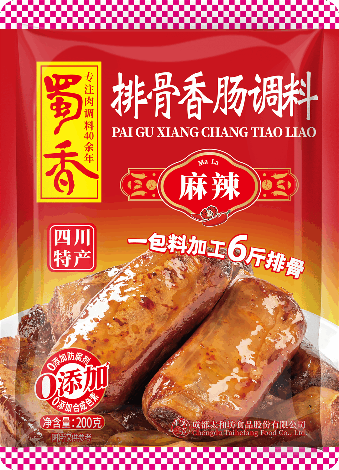 以使用当季新鲜花椒、辣椒,简单原料复合为四川特有味道。一包料6斤肉、味香、料足,是四川人记忆中独有的年味。“蜀香”品牌因发明和缔造了冬季调料这个产业而享誉四方,成为行业标杆,获得四川特产称号。
