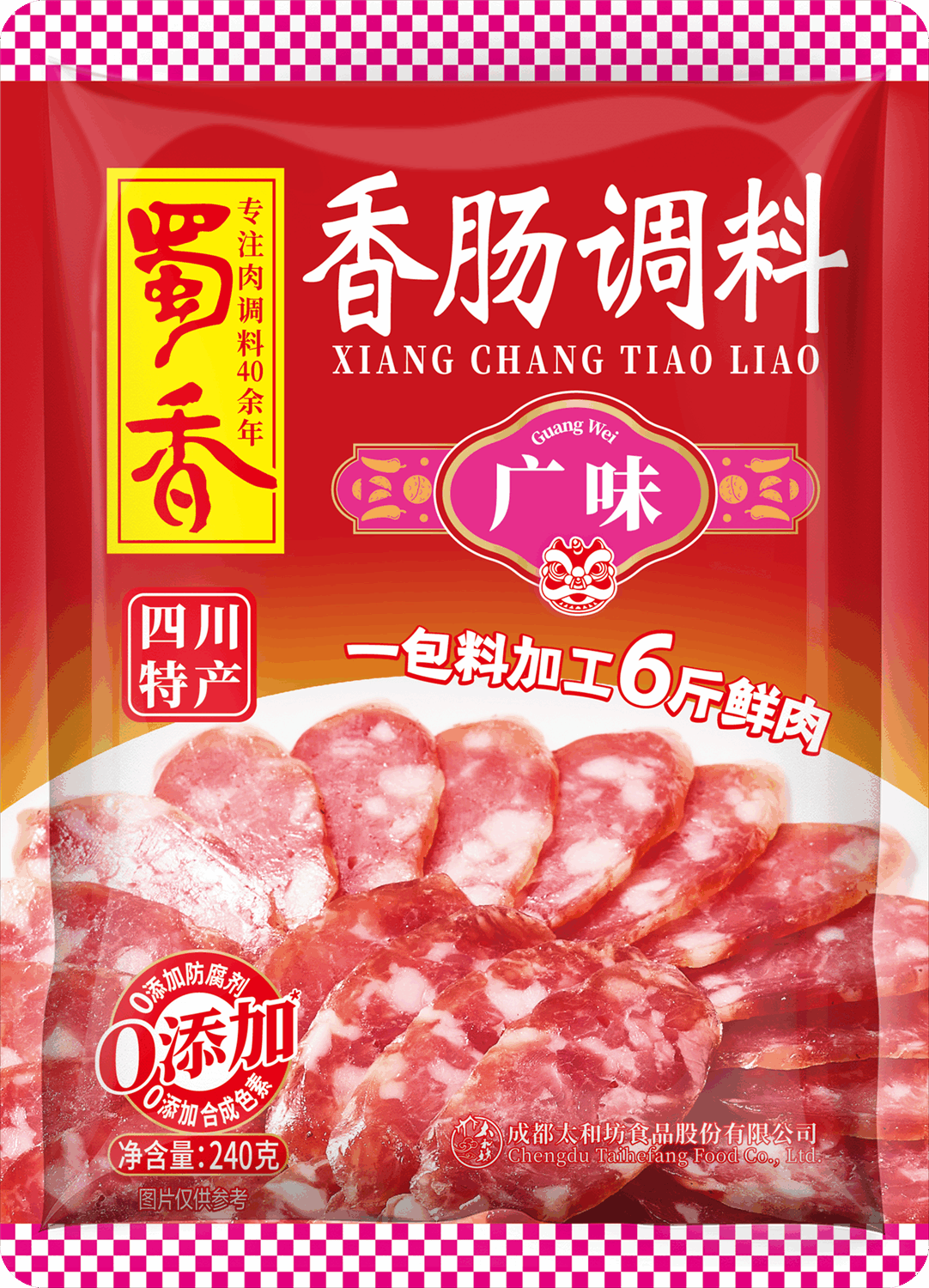 蜀香广味香肠调料,广式风味,咸甜适口,一包料灌 6 斤肉,轻松做出口味正宗的广味香肠。