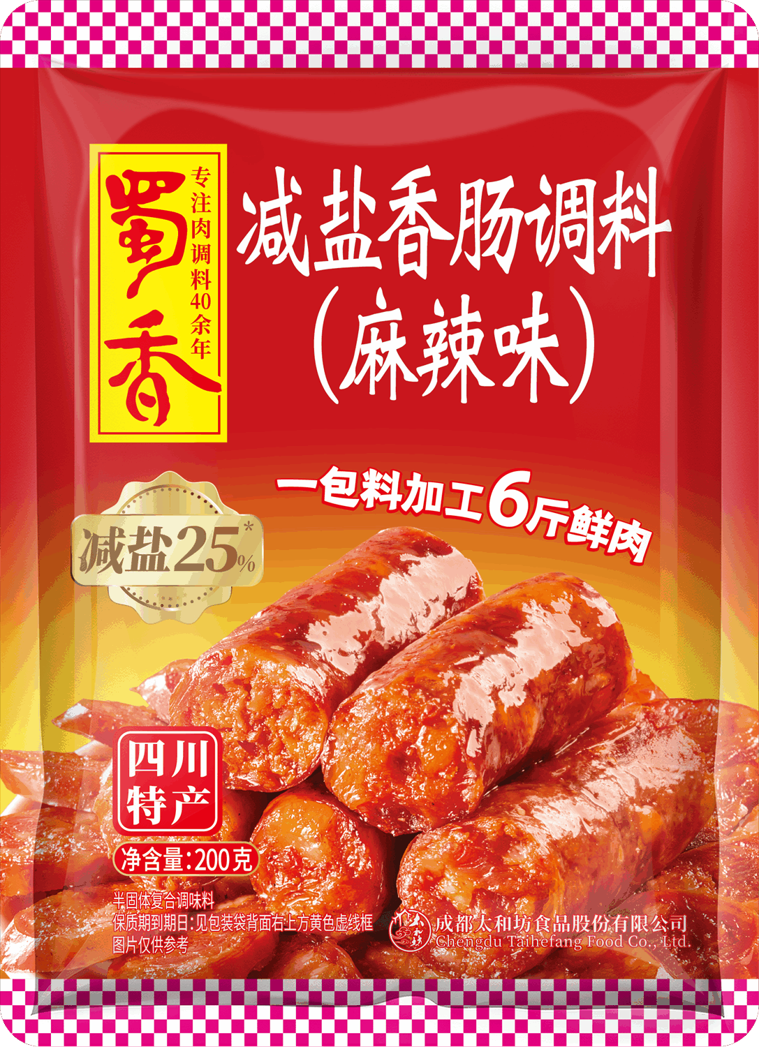 蜀香减盐麻辣香肠调料,减盐 25%,麻辣鲜香依旧,一包料灌 6 斤肉,轻松自制健康川味香肠。